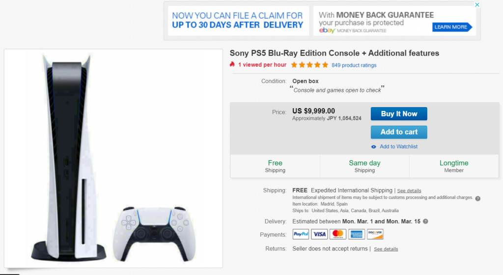 Sebagai gambaran harga Playstation 5 Standard Edition resmi dari SONY Store di Jepang adalah JPY 49.980 atau setara dengan 6 juta 600 ribu rupiah pada saat artikel ini ditulis. Selanjutnya Playstation 5 Digital Edition yang dijual dengan harga resmi JPY 39.980, kedua jenis PS5 ini diawali dengan pre-order pada tanggal 18 September 2020 dan meluncur tanggal 12 November 2020. Para scalper dengan gigihnya mencari stok PS5 tersebut dan menjualnya kembali dengan harga mulai dari JPY 80.000 bahkan rekor tertinggi yang penulis temukan pada saat ini dalam situs Ebay adalah sampai mencapai angka lebih dari JPY 1.000.000 yaitu nominal sekitar 133 juta rupiah. Dahsyat sekali barang langka ini. Membeli PS5 sudah terasa seperti membeli barang investasi yang harganya bukannya menurun tapi malah naik di pasaran.